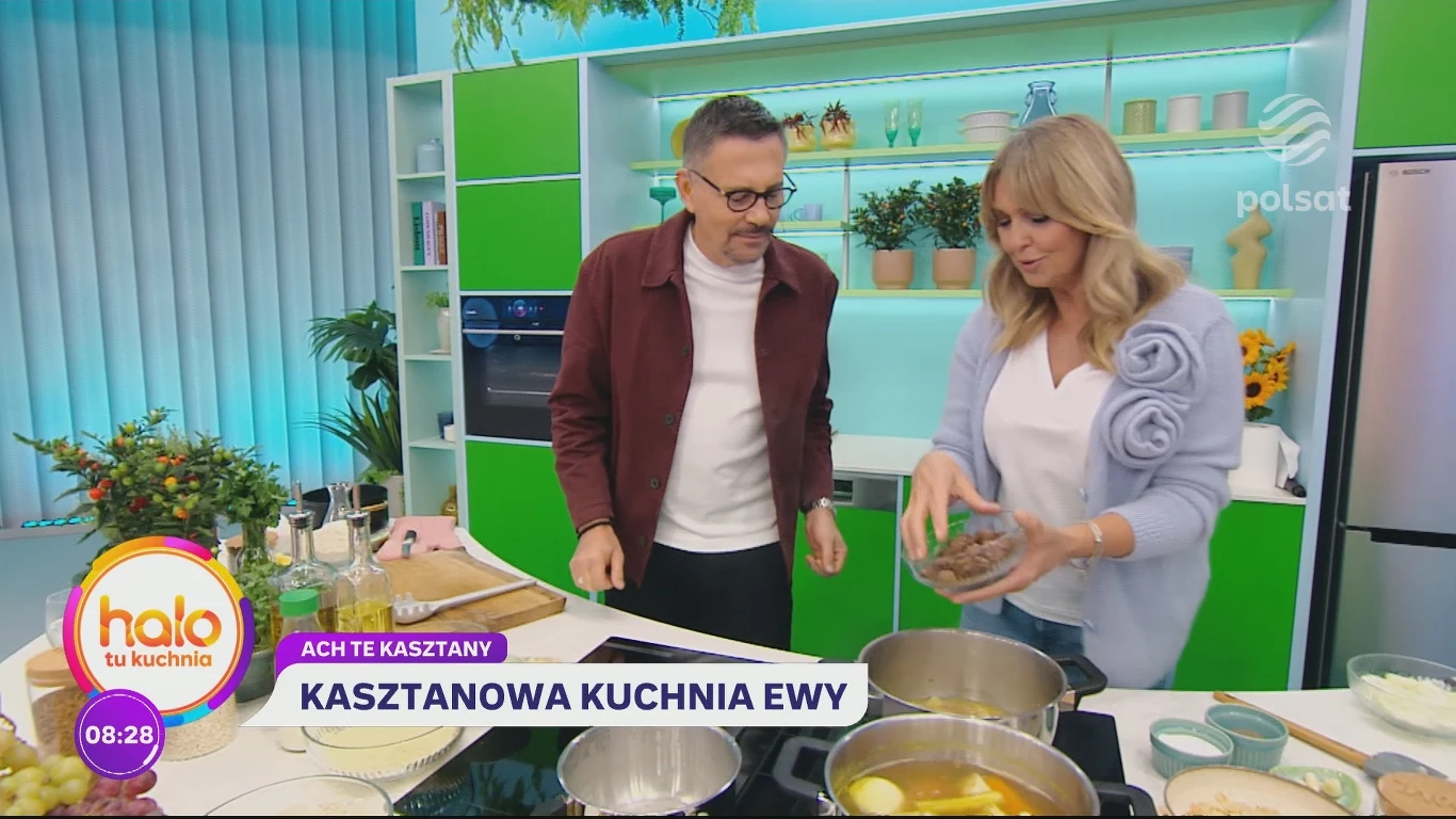 W pierwszej wizycie w kuchni “halo tu polsat” Ewa Wachowicz zdradziła, że tematem jej dzisiejszego gotowania są jadalne kasztany, które, chociaż wydają się niedostępne, można już kupić w każdym większym sklepie. I warto to zrobić, bo są wyjątkowo bogate w wiele witamin, w tym tę odpowiedzialną za zachowanie młodego wyglądu. Ewa zaczęła już przygotowywać pierwsze danie, czyli kremową kasztanową zupę.
